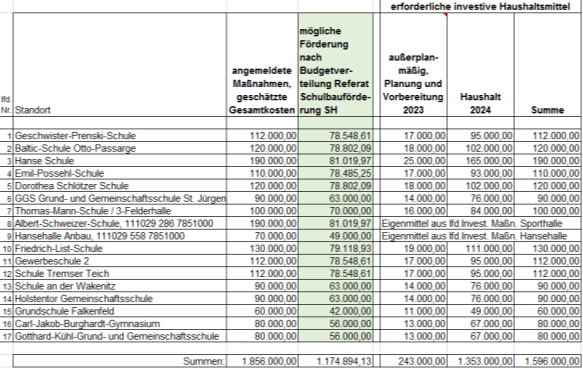 2023 wurden darüber hinaus außerplanmäßig investive Haushaltsmittel i.H.v. 243.000 € zur Komplementärfinanzierung von Planung und vorbereitenden Maßnahmen im Rahmen des Projektes „PV-Anlagen auf Lübecker Schulen“ durch die Bürgerschaft in 03/2023 freigegeben (VO/2023/11941). Dabei werden Fördermittel aus der „Richtlinie zur Umsetzung des Landesprogramms des Einsatzes von erneuerbaren Energien im Strom- und Wärmebereich im Zusammenhang mit Schulbaumaßnahmen“, veröffentlicht Veröffentlichung im Amtsblatt Schleswig –Holstein 2022 SB 3 - 19/202, in Höhe von bis zu 1.174.894,13 € durch das Land zur Verfügung gestellt.