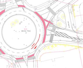 An den Plätzen sind bereits Hinweisschilder aufgestellt und die Fahrtrichtung wird durch Pfeile auf der Fahrbahn angegeben