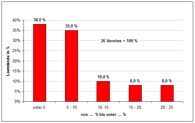 Von der Leerstandsproblematik sind die Vereine unterschiedlich betroffen. Die nachfolgende Grafik zeigt die Verteilung der Leerstandsquoten auf die 26 Kleingärtnervereine. Bei mindestens 7 Vereinen = 26% nehmen die Leerstände von 10% - 22,95% bedenkliche Ausmaße an.