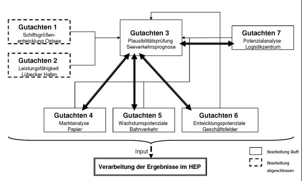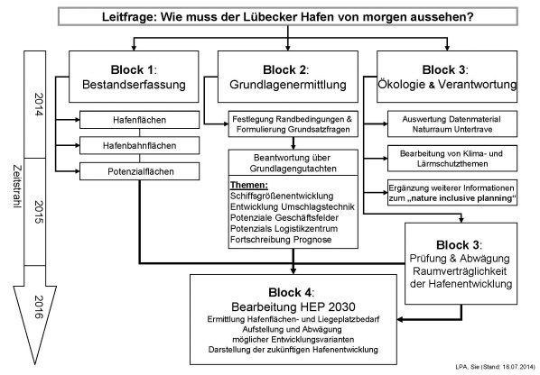 Die Bürgerschaft der Hansestadt Lübeck hat am 28.11.2013 unter TOP 10.6 (VO/2013/00904) den Bürgermeister beauftragt, für den Prognosezeitraum bis 2030 einen neuen Hafenentwicklungsplan (HEP) aufzustellen. Die LPA hat hierzu eine Grundstruktur für die Bearbeitung des Hafenentwicklungsplans 2030 aufgestellt. Demnach werden gem. den nachfolgenden Schaubildern im Block 2 die Grundlagendaten vor der eigentlichen Bearbeitung des Hafenentwicklungsplans im Block 4 erhoben. Die Ergebnisse der ersten beiden beauftragten Gutachten liegen mittlerweile vor und werden in diesem Bericht zusammengefasst. Weitere Erläuterungen sind aus den in der Anlage beiliegenden jeweiligen Kurzfassungen zu diesen Gutachten ersichtlich.