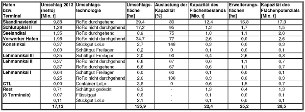 Die Skizzierung der Umschlagterminals mit den Umschlag- und Lagertechnologien zeigt den hohen Spezialisierungsgrad der einzelnen Teile des Lübecker Hafens. Die Ausrichtung der Terminals und die Ladungsstruktur der im Lübecker Hafen umgeschlagenen Güter sind aufeinander abgestimmt. Daher sind den Gesamthafen betreffende Kapazitätsaussagen immer im Bezug zu den Gütergruppen bzw. Umschlagtechnologien und z.T. auch zu den Terminals zu sehen. Tabelle 4 zeigt rechnerische Kapazitätsreserven gegenüber den Umschlagmengen zum Erfassungszeitpunkt von 5 Mio. t pro Jahr für die bestehenden Terminals und 11 Mio. t pro Jahr unter Einbeziehung der bereits ausgewiesenen Erweiterungsflächen.