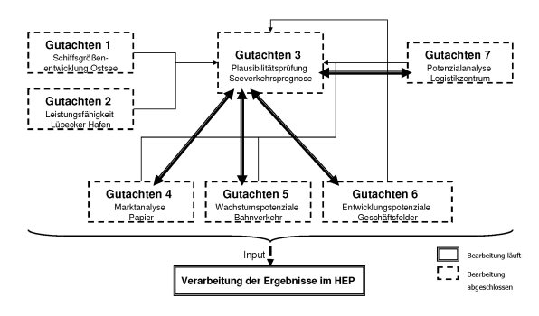 Die nachfolgenden Ergebnisse stellen somit eine Grundvoraussetzung dar, um die erforderlichen hafeninfrastrukturellen Anpassungen und Veränderungen – also die Ideal- und Groblayouts der einzelnen Hafenterminals für 2030 – im Block 4 (eigentlicher Hafenentwicklungsplan) bearbeiten und zeitlich priorisieren zu können.