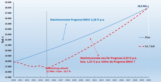 Die folgende Abbildung veranschaulicht, wie sich der Umschlag des Lübecker Hafens bis 2030 entwickeln müsste, wenn er in jedem Jahr des Planungszeitraumes um den prognostizierten durchschnittlichen Prozentsatz wächst. Dem sind die in den Jahren 2010 bis 2015 tatsächlich realisierten Umschläge gegenübergestellt.