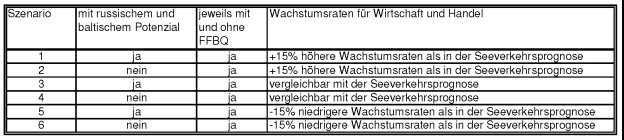 Die erstellten 6 Entwicklungsszenarien für den Hafenumschlag des Lübecker Hafens unterscheiden sich im Groben hinsichtlich des jeweiligen Wirtschafts- und Handelswachstums mit den jeweiligen relevanten Handelspartnern, der Berücksichtigung einer FFBQ im Prognosezeitraum oder nicht und der Berücksichtigung der russischen und baltischen Umschlagpotenziale oder nicht. In einer Übersicht sieht das wie folgt aus: