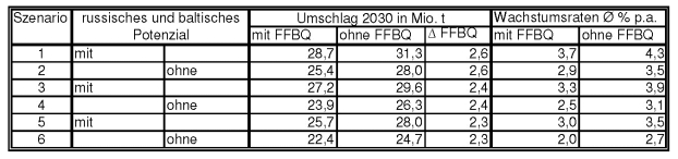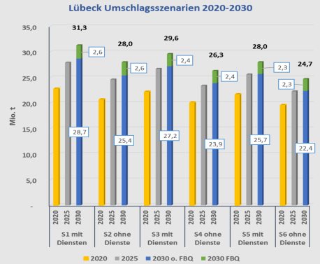 Insgesamt ergeben die Szenarien ein Umschlagspektrum von 22,4 Millionen t in Szenario 6 „Worst Case“ bis zu 33,3 Millionen t im „Best Case“ in Szenario 1. Die Szenarien 3 und 4 lassen sich als die Basisprognose bezeichnen, weil diese mit der Seeverkehrsprognose hinsichtlich der angesetzten Wachstumsraten vergleichbar sind. Das optimistische Szenario 1 geht davon aus, dass die FFBQ bis 2030 – also innerhalb des Prognosezeitraums - nicht realisiert wird, alle Umschlagpotenziale mit Russland und dem Baltikum über den Hafen Lübeck bis 2030 aktiviert werden können und der Außenhandel stärker als in der Basisprognose (um 25 %) vorgesehen wächst. Szenario 6 basiert auf einem abgeschwächten Wirtschaftswachstum und der Realisierung der FFBQ im Zeitraum 2025-2030. Die russischen und baltischen Potenziale sind in diesem Szenario nicht vorgesehen. In der Tabelle 2 werden die zukünftigen Umschlagmengen/-potenziale dargestellt.