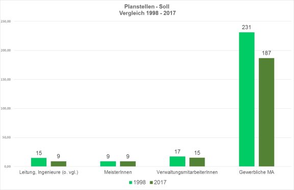 1998 waren in den Bereichen „Stadtgrün“ und „Friedhöfe“ insgesamt 272,4 Planstellen für die o. g. Aufgaben existent. 2017 sind im Bereich „Stadtgrün und Verkehr“ 220,5 Vollzeit- Planstellen vorhanden.