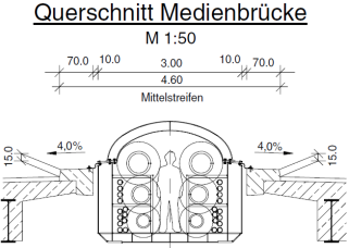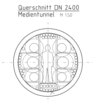 Als weitere Variante wurde ein begehbarer Medientunnel mit einem Durchmesser von ca. 2,40 m überlegt. Die Lage des Medientunnels war direkt unter dem Brückenbauwerk. Aufgrund der Kosten und der – wenngleich geringeren Folgekosten als bei der Medienbrücke – wurde die Variant ebenfalls verworfen.