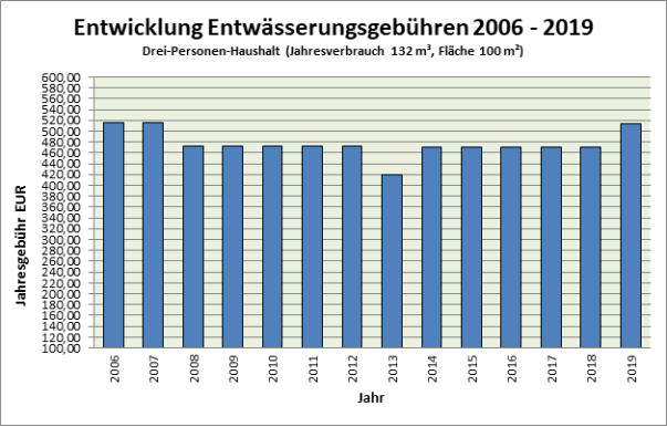 Ein durchschnittlicher Drei-Personen-Haushalt verbraucht 132 m³ Frischwasser im Jahr (destatis letzte Erhebung 2013). Die Zusatzgebühr betrug bislang 237,60 € im Jahr, die Grundgebühr bei einer angemessenen Zählergröße 164,40 € jährlich. Bei einer angeschlossenen Grundfläche eines Einfamilienhauses (Haus, Carport, Auffahrt) von 100 m², bedeutete dies eine Niederschlagswassergebühr von jährlich 69,00 €. Insgesamt ergibt sich für das Grundstück eine Abwassergebühr in Höhe von 471,00 €.