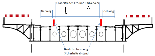 Daraus ergibt sich, dass die Geh- und Radwege längerfristig gesperrt werden müssen. In Abstimmung mit den zuständigen Abteilungen und der Straßenverkehrsbehörde wird einer der drei Fahrstreifen als Übergangslösung für Zufussgehende dienen (vgl. Schematische Verkehrsführung). Hierzu werden die Gehwege beidseitig, abgetrennt durch eine temporäre bauliche Schutzeinrichtung, neben den Fahrstreifen geführt. Somit ist gewährleistet, dass keine Querung mit dem Kfz- und Radverkehr notwendig ist. Der Kfz- und Radverkehr wird mit den verbleibenden Fahrspuren mit entsprechenden Markierungen in die Brückenmitte gerückt und erhält je einen Fahrstreifen in jede Richtung (stadteinwärts und stadtauswärts). Selbstverständlich dürfen gemäß den Regelungen der StVO Kinder, die auf dem Fahrrad unterwegs sind, bis zur Vollendung des 10. Lebensjahres die Gehwege nutzen.