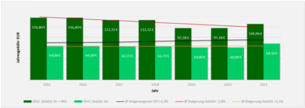 Die nachfolgende Grafik zeigt die Entwicklung der Straßenreinigungsgebühren im Vergleich zur allgemeinen Inflationsrate (Verbraucherpreisindex). Danach beträgt die durchschnittliche Infaltionsrate im Betrachtungszeitraum 1,3 %/Jahr. Bei der ausgewählten Reinigungsklasse 6 und 8 Frontmetern ist die Straßenreinigungsgebühr lediglich um 1,1 %/Jahr gestiegen. Wird zusätzlich zur Straßenreinigungsgebühr auch noch eine Winterdienstgebühr erhoben, ist die Gesamtgebühr im selben Zeitraum sogar um 1,8 %/Jahr gesunken.
