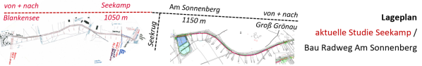 Bei der jüngst abgeschlossenen, straßenbegleitenden Wegherstellung Am Sonnenberg auf dem Gebiet der Gemeinde Groß Grönau handelt es sich um einen Neubau eines Gehweges mit Zusatzzeichen „Radfahrer frei“. Hier ist das Radfahren auf der Fahrbahn im Mischverkehr zwischen Blankensee und Groß Grönau auch weiterhin möglich, so dass sowohl in Groß Grönau als auch auf dem Lübecker Stadtgebiet eine durchgehende Radführungsform gegeben ist.