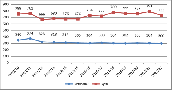 Abb. 1: Aufnahmen an den drei aktuellen Gemeinschaftsschulen mit Oberstufe (GemSmO) und an Gymnasien (Gym)