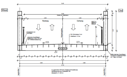 Der Maßnahme kommt andererseits zugute, dass inzwischen die Leitungsträger für die Auslagerung auf die Behelfsbrücke während der geplanten Instandsetzung der Mühlentorbrücke weitgehend keinen Bedarf mehr sehen. Die Konsole für die Leitungsführung kann dadurch entfallen und die Gesamtbreite der Brücke beträgt jetzt 6,50m.