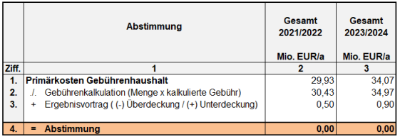 Aus der Nachkalkulation 2020 ergibt sich insgesamt ein Gebührenmehrbedarf in Höhe von 0,895 Mio. EUR/a, der in den durchschnittlichen gebührenfähigen Kosten enthalten ist. Dieser Gebührenmehrbedarf aus Unterdeckungen in Vorjahren kann aufgrund des § 6 Abs. 2 KAG im Gebührenkalkulationszeitraum ausgeglichen werden.