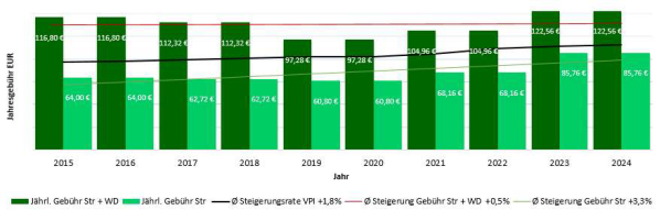 Die nachfolgende Grafik zeigt die Entwicklung der Straßenreinigungsgebühren im Vergleich zur allgemeinen Inflationsrate (Verbraucherpreisindex). Danach beträgt die durchschnittliche Inflationsrate im Betrachtungszeitraum 1,8 %/Jahr, allerdings beträgt die derzeitige Inflationsrate ca. 7,6 %/Jahr. Das ist bei der Planung für die nächsten Jahre zu berücksichtigen. Bei der beispielhaft ausgewählten Reinigungsklasse 6 mit 8 Frontmetern steigt die Straßenreinigungsgebühr in absoluten Beträgen lediglich um 17,60 EUR/Jahr auf eine Jahresgebühr von 122,56 EUR. Diese Gebühr ist typisch für einen Drei-Personen-Haushalt in einem Einfamilienhaus.
