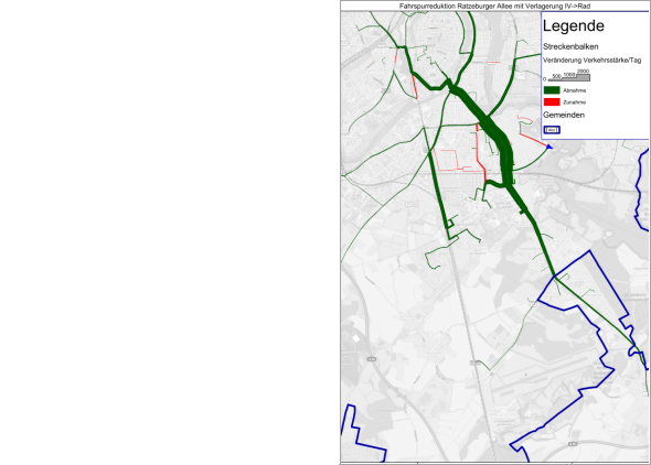 Im Veränderungs-Szenario“ wird davon ausgegangen, dass sich im Mobilitätsverhalten aufgrund des Radschnellweges Veränderungen einstellen und sich damit das Kfz-Verkehrsaufkommen verändert. Die Kfz-Verkehrsbelastung sinkt im südlichen Abschnitt der Ratzeburger Allee auf rund 14.000 16.000 Kfz am Tag (vorher 16.000 17.000 Kfz/Tag), im nördlichen Abschnitt auf 11.000 Kfz am Tag (vorher 13.000 Kfz/Tag). Diese Rückgänge zeigen sich insbesondere auf der Ratzeburger Allee Richtung St. Hubertus, aber auch in Richtung Universitätsgelände (vgl. Abbildung 3).