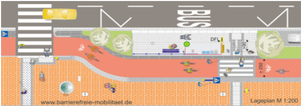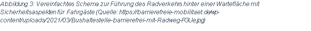 Konflikte zwischen Fahrgästen und Radfahrenden können prinzipiell nicht ausgeschlossen werden. Bereits jetzt ssen die Fahrgäste die Radwege überqueren, um zur Wartefläche zu gelangen. Durch die Nutzung der Ratzeburger Allee durch verschiedenste Verkehrsteilnehmer:innen und mittel ist es unmöglich, eine vollends konfliktfreie Umgebung zu schaffen. Durch Umsetzung des Radschnellwegs und der damit verbundenen Umgestaltung der Bushaltestellen können jedoch Standardwerke umgesetzt werden, die durch ihre Regelungsinhalte zu einer Steigerung der Sicherheit beitragen. Dadurch werden Haltestellen barrierefrei und erhalten gleichzeitig eine ausreichend große Wartefläche (in Länge und Breite), um Konflikte zwischen Radverkehr und wartenden Fahrgästen möglichst zu vermeiden. Die Auseinandersetzung mit der genannten Problematik wird in der Entwurfsplanung zum Radschnellweg erfolgen. Eine erste Orientierung geben bestehende Konzepte/Visualisierungen anderer Städte und Kreise (vgl. Abbildung 3).