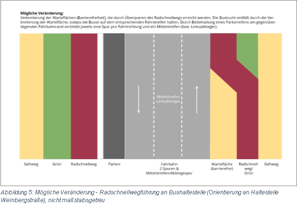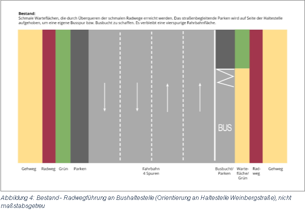 Ein weiteres Konfliktfeld kann sich zwischen Bussen und Kfz ergeben. Durch die Umgestaltung der Busbuchten zu Fahrbahnrandhaltestellen oder Haltestellenkaps kommt es zu einer Begrenzung des Verkehrsraums, den sich Kfz und Busse teilen. Die Problematik, dass Kfz ggf. hinter einem haltenden Bus warten müssen, ist bekannt und soll durch verschiedene Lösungsansätze im Rahmen der Entwurfsplanung bearbeitet werden. Die folgenden schemenhaften Zeichnungen zeigen den Bestand und eine mögliche Variante auf, mit der dem genannten Konflikt begegnet werden kann (vgl. Abbildung 4 und 5). Die Variante ist ausdrücklich nicht abschließend und soll eine Möglichkeit der Radschnellwegführung an Bushaltestellen skizzenhaft darstellen.