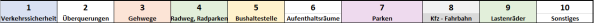 Aktuell ist vorgesehen, dass alle in dem Beteiligungsprozess eingebrachten Rückmeldungen mit den jeweiligen Problemsichtweisen, Wünschen und Zielvorstellungen fachlich in drei Bereiche (Verkehrsplanung, Abwasserentwässerung, Klimaschutz) zugeordnet werden. Die Verkehrsplanung wird mit zehn Unterthemen detailliert ausgewertet: