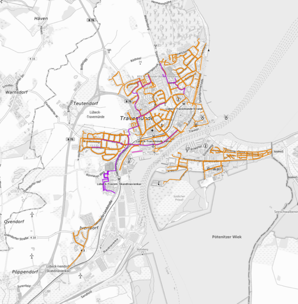 Abbildung: Betroffene Straßen des Breitbandausbaus in Travemünde; orange markierte Straßen werden federführend durch TraveNetz, magenta markierte Straßen federführend durch die Telekom ausgebaut