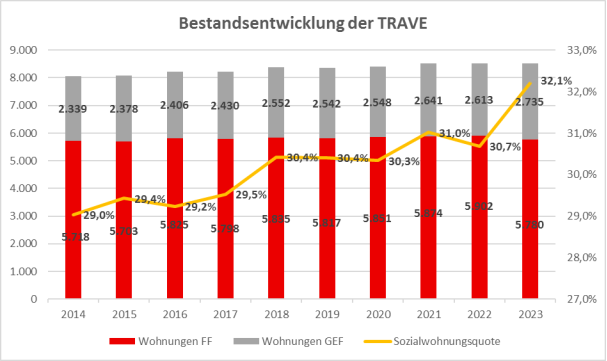 Die TRAVE hat in den vergangenen zehn Jahren mit ihren jährlichen Wohnungsbau-programmen zur Steigerung von Wohnraum in Lübeck beigetragen. Das Programm umfasst den Bau neuer Wohnungen sowie die Sanierung und Modernisierung bestehender Gebäude. Es trägt auf diese Weise dazu bei, die Wohnungsversorgung zu verbessern und den steigenden Bedarf an Wohnraum zu decken. Mit dem Programm wird insbesondere der soziale Wohnungsbau gefördert. Mit 2.735 geförderten Wohnungen[5] besitzt die TRAVE nach absoluten Zahlen im Jahr 2023 den größten Bestand in Lübeck. Dies entspricht einer Quote von 32,1 %.