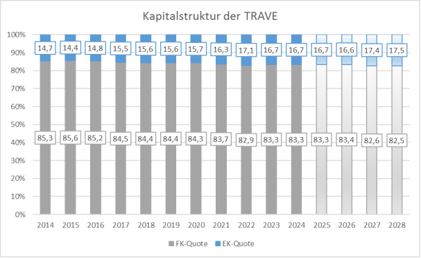Die Jahresüberschüsse der TRAVE lagen in diesem Zeitraum deutlich über der Ausschüttung. Die übrig gebliebenen Beträge (nach Abzug der Ausschüttung) wurden in die Gewinnrücklage eingestellt („thesauriert“). Auf diese Weise konnte das Eigenkapital sukzessive erhöht und die Eigenkapitalquote langsam aber stetig gesteigert werden.