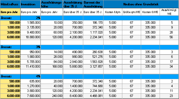 Die TRAVE hat verschiedene Szenarien von Mittelzuflüssen ins Eigenkapital (gelb unterlegt) durchgerechnet und in der folgenden Tabelle die möglichen Auswirkungen aufgezeigt. In den Spalten wird dargestellt, in welcher Größenordnung Investitionen getätigt werden können und in welcher Höhe Ausschüttungen an die Geldgeber (zum jeweiligen Zinssatz) pro Jahr und über den „Lebenszyklus“ erfolgen. Es endet mit den Kosten für Neubauten und wie viel Wohnraum mit der Bereitstellung der zusätzlichen Mittel jährlich bis ca. 2030 geschaffen werden könnte.