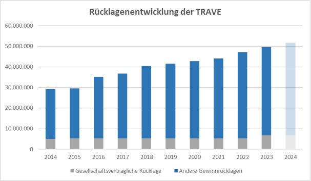 Bei der TRAVE besteht eine Gewinnrücklage in Form der satzungsmäßigen Rücklage. „Satzungsmäßig“ bedeutet, dass im Gesellschaftsvertrag geregelt ist, wie die Rücklage zu bilden ist. Ihre Aufstockung erfolgt in den Folgejahren stets dann, wenn das Stammkapital erhöht wurde. Die Regelung im Gesellschaftsvertrag der TRAVE sieht vor, dass die satzungsgemäße Rücklage die Hälfte des Stammkapitals beträgt. Ist diese Größe nicht erreicht, sind mindestens 10 % des Jahresergebnisses der Rücklage zuzuführen, bis die Hälfte erreicht ist.