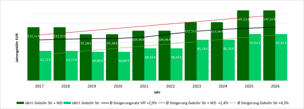 Die nachfolgende Grafik zeigt die Entwicklung der Straßenreinigungsgebühren im Vergleich zur allgemeinen Inflationsrate (Verbraucherpreisindex). Danach beträgt die durchschnittliche Inflationsrate im Betrachtungszeitraum 2,9 %/Jahr. Bei der beispielhaft ausgewählten Reinigungsklasse 6 mit 8 Frontmetern steigt die Straßenreinigungsgebühr mit Winterdienstklasse 1 in absoluten Beträgen um 24,96 EUR/Jahr auf eine Jahresgebühr von 147,52 EUR. Ohne Winterdienst steigt die Straßenreinigungsgebühr um 12,16 EUR/Jahr auf eine Gebühr von 97,92 EUR im Jahr.