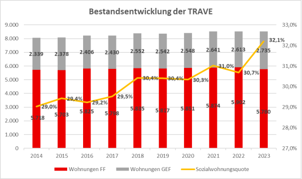 Trotz der jahrelangen umfangreichen Sanierungs- und Neubautätigkeiten besitzt die TRAVE noch immer einen großen Bestand an älteren Wohngebäuden – insbesondere der 1960er Jahre – die eine noch weitgehend baujahrstypische Substanz aufweisen und die den künftigen Anforderungen der Nachfrage an eine moderne Ausstattung und an Energieeffizienz kaum mehr genügen. Die TRAVE unternimmt deshalb auch in den kommenden Jahren erhebliche organisatorische und finanzielle Anstrengungen zur Erneuerung ihres Wohnungsbestandes.
