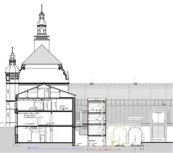 - Brandschutz: Der Mindestabstand zum Ostflügel des Bahnhofes wird unterschritten. Durch eine Bauvoranfrage wurde bereits ein Brandschutzprüfer um Stellungnahme gebeten. Eine Rückmeldung steht trotz wiederholter Nachfragen aus.