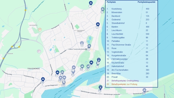 Abb.1: Übersicht der Parkplätze in Travemünde, transparente Markierungen sind ohne Live-Daten (nicht in Parkleitsystem integriert) © KWL