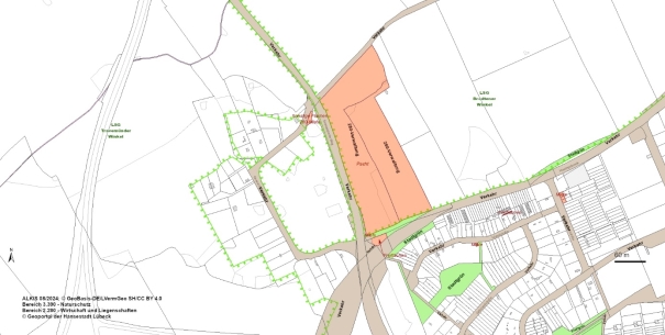 Die vorgeschlagene Fläche liegt am Ortseingang Travemündes nördlich der B75. Sie setzt sich aus den Flurstücken 44/3 und 91/38 der Gemarkung Gneversdorf zusammen (Abb. 2, orange eingefärbt) und grenzt an die Kreuzung Howingsbrook und Timmendorfer Weg an. Die Erschließung erfolgt über die Straße Howingsbrook, mit direkter Anbindung an die B75.