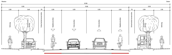 - Anlage von zwei Radfahrstreifen auf der Fahrbahn in einer Breite von je 2,25 m (Regelmaß für Radfahrstreifen 1,85 m gemäß ERA 2010)