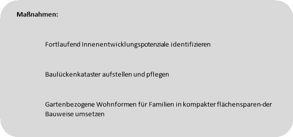 Um diesen Weg fortzuführen ist die kontinuierliche Identifikation und Aktivierung von Innenentwicklungspotenzialen erforderlich. Ein regelmäßig aktualisiertes Baulückenkataster bildet hierfür eine wichtige Grundlage. Ergänzend soll eine stadtweite Potenzialkarte erarbeitet werden, die Bereiche für Zweite-Reihe-Bebauung, Aufstockungsmaßnahmen und andere Nachverdichtungsoptionen definiert.