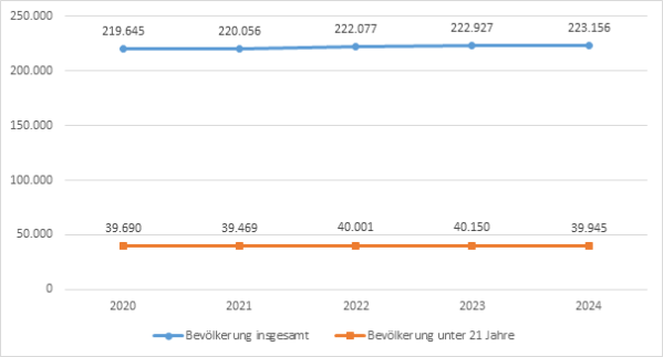 Abbildung 1: Bevölkerung und unter 21-Jährige mit Erstwohnsitz in Lübeck am jeweils 31.12. des Berichtsjahres (Quelle: Kommunale Statistikstelle Hansestadt Lübeck 2024; eigene Darstellung)