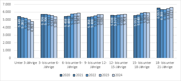 Der Geburtenrückgang hat Auswirkungen auf die Binnenaltersstruktur junger Menschen in Lübeck. Zwar blieb die Gesamtzahl der unter 21-Jährigen vergleichsweise stabil, aber in Folge der zurückgehenden Geburten ist die Anzahl der unter 3-Jährigen in Lübeck deutlich rückläufig (s. Abb. 3). Seit 2020 ist sie von 5.449 auf 4.783 gesunken, was einem Rückgang von 12,2 % entspricht. Auch die Altersgruppe der 3- bis unter 6-Jährigen ist zurückgegangen, und zwar um 5,5 % von 5.394 auf 5.709. Bei den übrigen Altersgruppen lässt sich eine Stagnation oder leichte Steigerung beobachten. Insbesondere die geburtenstarken Jahrgänge 2015 und 2016 bilden sich in der Altersstruktur der 6- bis unter 12-Jährigen ab.