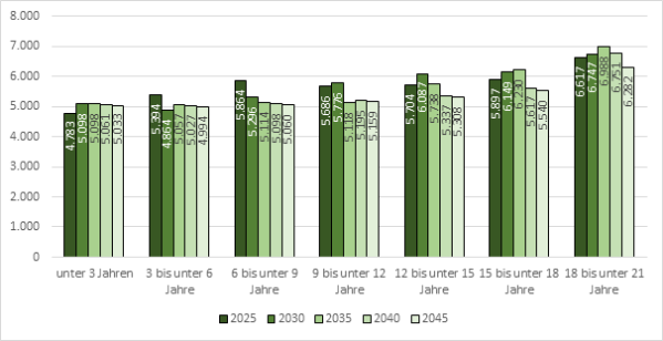 Abbildung 4: Unter 21-Jährige nach Altersgruppen gemäß der Bevölkerungsprognose der Hansestadt Lübeck (Quelle: Kommunale Statistikstelle Hansestadt Lübeck 2025; eigene Darstellung)