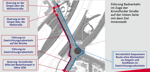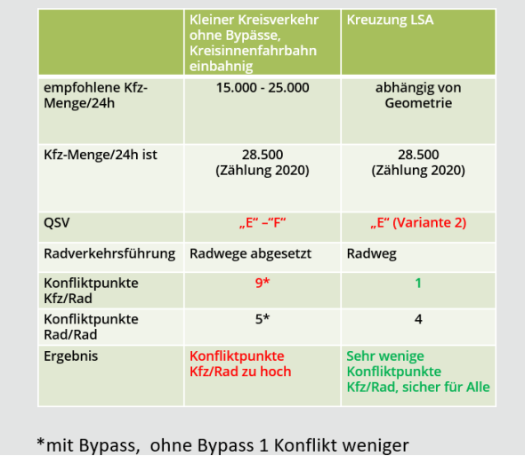 Die Anzahl der Konfliktpunkte zwischen Kfz und Rad sowie Rad und Rad ist neben der Akzeptanz der Radverkehrsführung das maßgebliche Kriterium. Während es bei der Kreisverkehrslösung 9 Konfliktpunkte (ohne Bypass 8 Konfliktpunkte) zwischen Kfz und Rad gibt, ist es bei der signalisierten Kreuzungslösung 1 Konfliktpunkt.