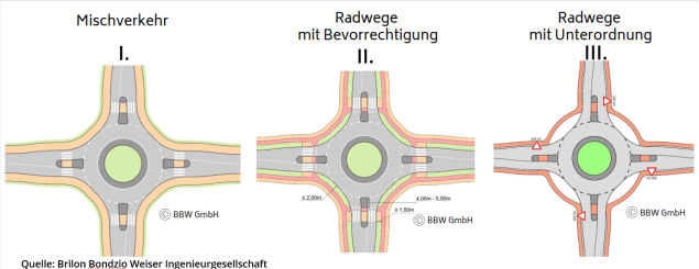 Es gibt grundsätzlich drei Führungsformen für den Radverkehr an Kreisverkehrsplätzen: