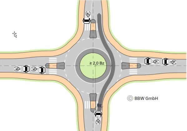- Mischverkehr, d. h. die Radfahrenden fahren gemeinsam mit dem Kfz-Verkehr auf der Kreisfahrbahn.