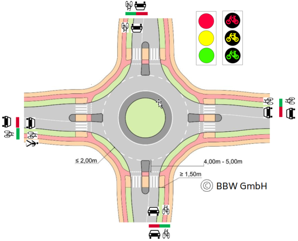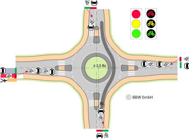 Die Signale müssten in ausreichender Entfernung zum Kreisverkehr angeordnet werden. Es darf nicht für den Kfz-Verkehr der Eindruck entstehen, dass Grün die Vorfahrtsregelung am Kreisverkehr außer Kraft setzt.