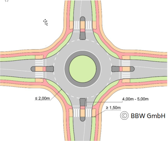 - Schaffung von vom Kreisverkehr abgesetzten Fahrrad- und Fußgängerüberwegen an der
