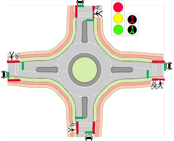 Zunächst könnte der Radverkehr aus allen Richtungen Grün erhalten und beachtet dann im Kreisverkehrsplatz die jeweilige Vorfahrt.