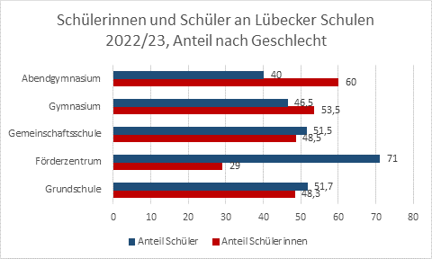 Auf die Emil-Possehl-Schule (Berufsschule insbesondere für technische Ausbildungsberufe, Agrar, Bau, Elektro, Metall, Holz, KFZ) gingen 2018/19 nach wie vor deutlich mehr Jungen (3298 = 89%) als Mädchen (406 = 11%). Genau umgekehrt verhält es sich bei der Dorothea-Schlözer-Schule (Berufsschule für Ausbildungsberufe in den Bereichen Ernährung, Gesundheit, Sozialwesen): 1567 junge Frauen und 385 junge Männer (80% Frauen, 20% Männer). Bei den weiteren Berufsschulen in Lübeck ist das Geschlechterverhältnis ausgeglichener. Der Anteil der Frauen an den anderen drei Berufsschulen lag 2018/19 zwischen 35% (Friedrich-List-Schule) und 55% (Hanse-Schule für Wirtschaft und Verwaltung).