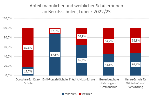 Auf die Emil-Possehl-Schule (Berufsschule insbesondere für technische Ausbildungs[1]berufe, Agrar, Bau, Elektro, Metall, Holz, KFZ) gingen 2022/23 nach wie vor deutlich mehr Jungen (rund 88%) als Mädchen (12,5%). Genau umgekehrt verhält es sich bei der Dorothea-Schlözer-Schule (Berufsschule für Ausbildungsberufe in den Bereichen Ernährung, Gesundheit, Sozialwesen), die 2022/23 zu 82% von jungen Frauen und zu 17,7% von jungen Männern besucht wurde. Bei den weiteren Berufsschulen in Lübeck ist das Geschlechterverhältnis ausgeglichener.
