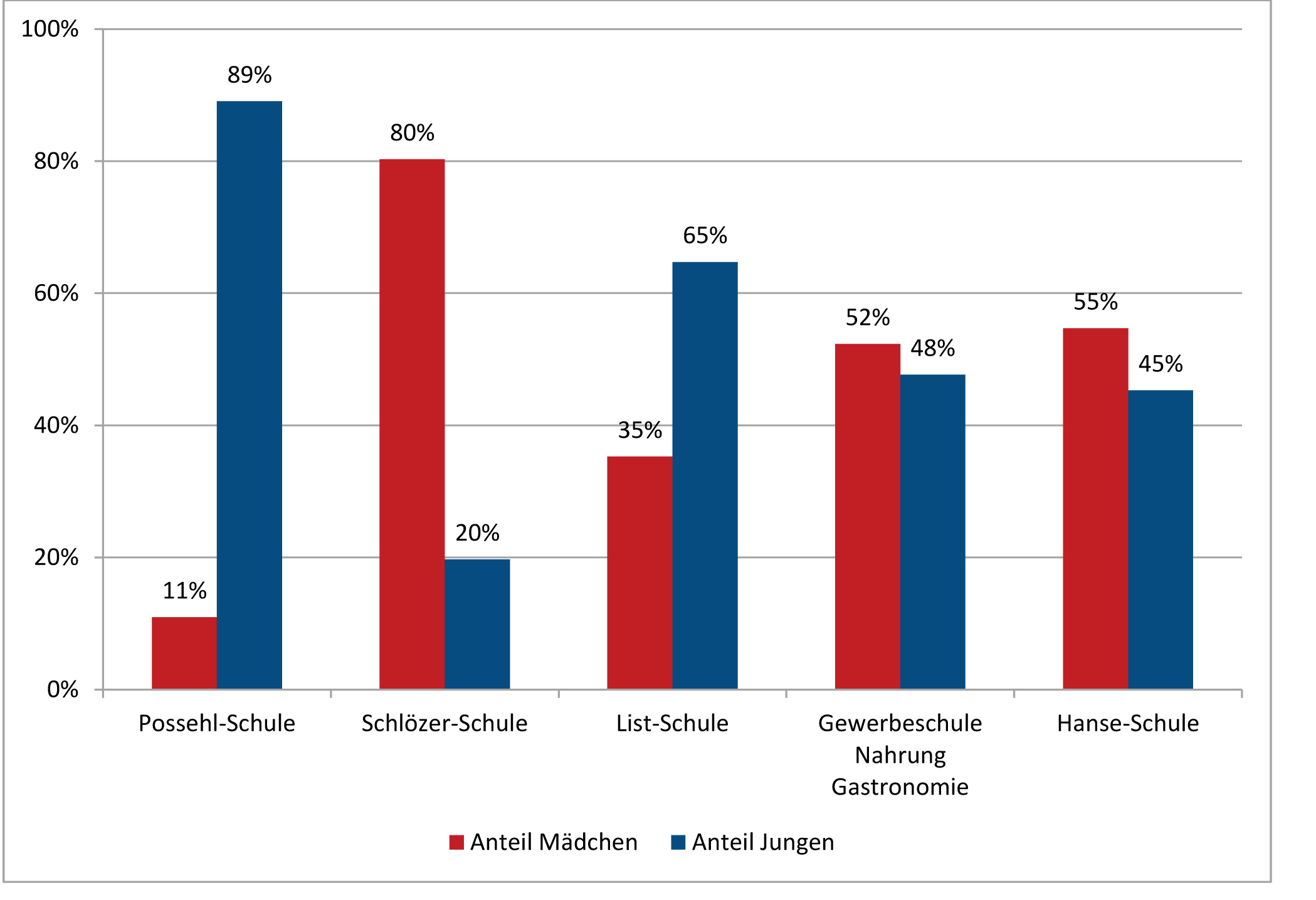 Die geschlechtsspezifische Wahl der Ausbildungsberufe zeigt sich in Lübeck unter anderem an der unterschiedlichen Zahl der Schülerinnen und Schüler an den Berufsschulen. Überwiegend junge Frauen (80%) sind nach wie vor an der Dorothea-Schlözer-Schule zu finden, überwiegend junge Männer an der Emil-Possehl-Schule (89%).