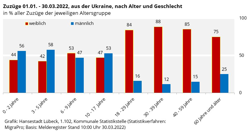 Im Gegensatz zu den Flüchtenden im Jahr 2015 ff kommen aktuell (2022) deutlich mehr Frauen mit Kindern als Flüchtlinge nach Lübeck.