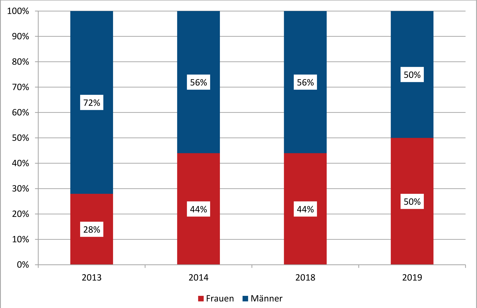 In Lübeck ist der Anteil der Frauen, die von städtischer Seite in die Aufsichtsräte kommunaler Unternehmen entsandt wurden, von 28% Frauen (2013) auf 44% (2014/2018) gestiegen.