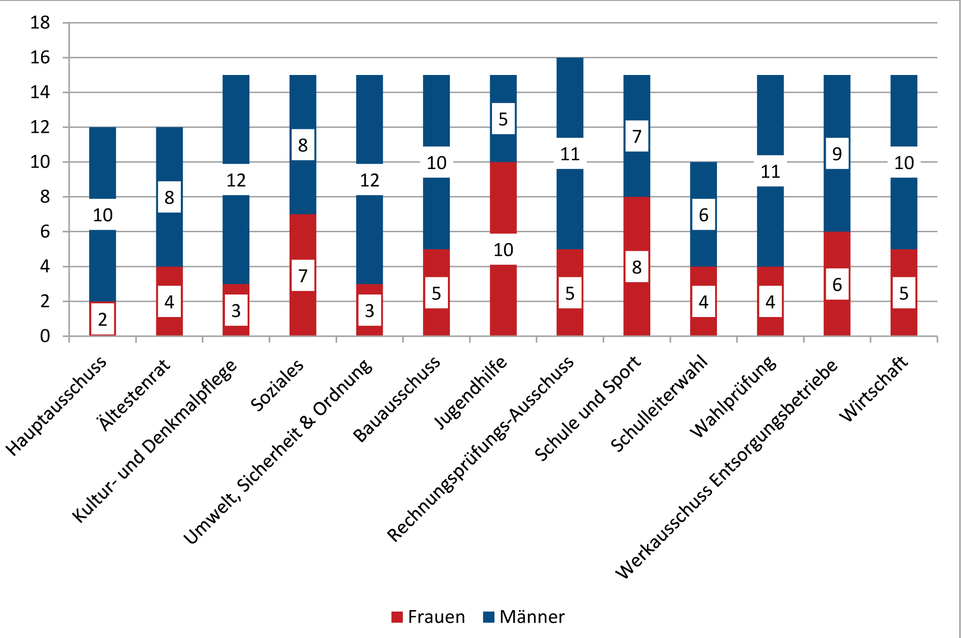 In den meisten Ausschüssen der Bürgerschaft waren 2018 mehr Männer als Frauen vertreten, z.B. im Hauptausschuss (10 Männer/ 83,4%; 2 Frauen/ 16,6%), aber auch im Bau-, Wirtschafts- oder Kulturausschuss. In den Ausschüssen für Jugendhilfe, Schule und Soziales waren mehr Frauen als Männer vertreten. Nur im Jugendhilfeausschuss ist Parität vorgeschrieben. In §4(6) der Satzung für das Jugendamt der Hansestadt Lübeck (Fassung vom 23.02.2006) ist geregelt, dass bei der Bildung des Jugendhilfeausschusses zu gewährleisten ist, “dass Frauen und Männer zu gleichen Anteilen vertreten sind.“